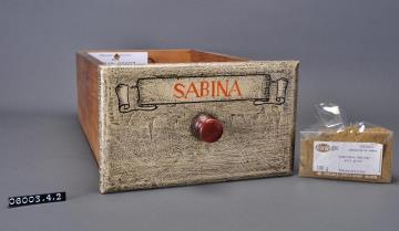 Schublade aus Nadelholz mit rotem Knauf und gezinkten Verbindungen (Schwalbenschwanzverbindung). Boden angeleimt und mit Holznägeln gesichert. Vorderfront maserierend grau-braun mit roter Signatur in aufgemalener Banderole. Enhält Sadebaumspitzen, gepulvert.