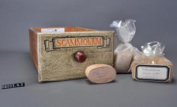 Schublade aus Nadelholz mit rotem Knauf und gezinkten Verbindungen (Schwalbenschwanzverbindung). Boden angeleimt und mit Holznägeln gesichert. Vorderfront maserierend grau-braun mit roter Signatur in aufgemalener Banderole. Enhält graues und braunes Skammoniumharz-Pulver sowie eine Spanschachtel mit Pulverbriefchen mit Skammonium-Harz von Smyrna.