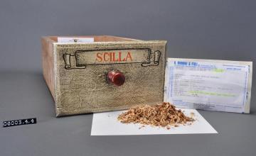 Schublade aus Nadelholz mit rotem Knauf und gezinkten Verbindungen (Schwalbenschwanzverbindung). Boden angeleimt und mit Holznägeln gesichert. Vorderfront maserierend grau-braun mit roter Signatur in aufgemalener Banderole. Enhält Meerzwiebel, geschnitten.