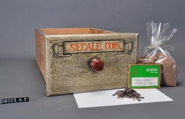 Schublade aus Nadelholz mit rotem Knauf und gezinkten Verbindungen (Schwalbenschwanzverbindung). Boden angeleimt und mit Holznägeln gesichert. An seitlicher Schubladenseite altes Preisschild. Vorderfront maserierend grau-braun mit roter Signatur in aufgemalener Banderole. Enhält Mutterkorn ganz und gepulvert. Mit Einkaufspreis (100g Lire 1500.-) und -datum (Mai 1974), beschriftet von Toni Kerer.