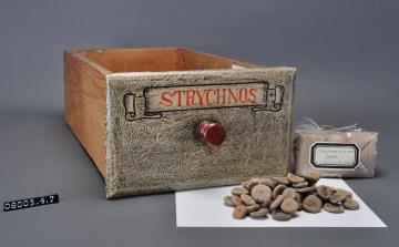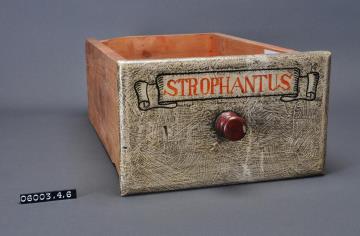 Schublade aus Nadelholz mit rotem Knauf und gezinkten Verbindungen (Schwalbenschwanzverbindung). Boden angeleimt und mit Holznägeln gesichert. Vorderfront maserierend grau-braun mit roter Signatur in aufgemalener Banderole. Seitlich gezahntes Schild mit Preisangabe. Ohne Inhalt. Enthielt Strophantussamen.