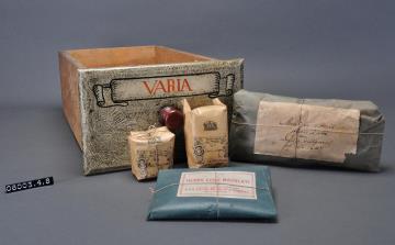 Schublade aus Nadelholz mit rotem Knauf und gezinkten Verbindungen (Schwalbenschwanzverbindung). Boden angeleimt und mit Holznägeln gesichert. Vorderfront maserierend grau-braun mit roter Signatur "Varia" in aufgemalener Banderole. Enhält eine historische Packung beschriftet "Semina Conii maculati seu Cicutae vulgaris" (ab anno 1847); eine Originalpackung, beschriftet "Herba Conii maculati 10g von Fritz-Petzold & Süss AG, Wien; zwei Packungen mit Etikett der Stadtapotheke des Friedr. Peer in Brixen mit historischer Beschriftung "20g Herb.Conii macul. 1913".