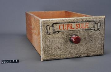 Schublade aus Nadelholz mit rotem Knauf und gezinkten Verbindungen (Schwalbenschwanzverbindung). Boden angeleimt und mit Holznägeln gesichert. Vorderfront maserierend grau-braun mit roter Signatur in aufgemalener Banderole. Enhielt Kupfersulfat.