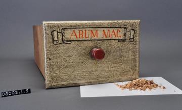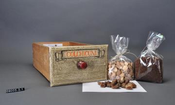 Schublade aus Nadelholz mit rotem Knauf und gezinkten Verbindungen (Schwalbenschwanzverbindung). Boden angeleimt und mit Holznägeln gesichert. Vorderfront maserierend grau-braun mit roter Signatur in aufgemalener Banderole. Enhält ganze, etwas wurmlöchrige Herbstzeitlosenknollen, sowie Herbstzeitlosensamen.
