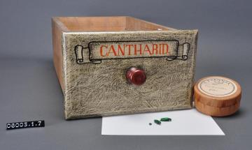 Schublade aus Nadelholz mit rotem Knauf und gezinkten Verbindungen (Schwalbenschwanzverbindung). Boden angeleimt und mit Holznägeln gesichert. Vorderfront maserierend grau-braun mit roter Signatur in aufgemalener Banderole. Enhält Ganzdroge und Pulver der Spanischen Fliegen.