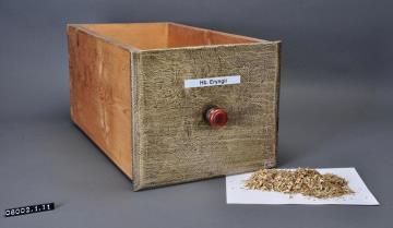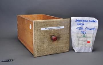 Schublade aus Nadelholz mit rotem Knauf und gezinkten Verbindungen (Schwalbenschwanzverbindung). Boden angeleimt und mit Holznägeln gesichert. Leicht wurmstichig. Vorderfront grau-braun angemalen. Mit selbstklebendem, laminiertem, weißem Kunststoff-Schriftband beschriftet. Enhält Sonnentau, geschnitten.