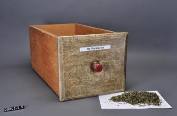 Schublade aus Nadelholz mit rotem Knauf und gezinkten Verbindungen (Schwalbenschwanzverbindung). Wurmstichig. Vorderfront grau-braun angemalen. Mit selbstklebendem, laminiertem, weißem Kunststoff-Schriftband beschriftet. Enhält Osterluzei-Kraut geschnitten.