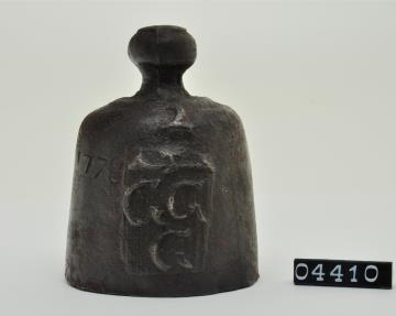 Glockenförmiges Gewicht aus Eisen mit Knopf. Innen hohl mit Öffnung im Boden. Mit Blei ausgefüllt, um das Gewicht exakt zu justieren. An der Wand, mitgegossen, ein Wappenschild mit drei "G" und darüber die Zahl Zwei. Links vom Wappenschild ist die Jahrzahl 1778 eingraviert. Wiegt genau 1118,88 gr.