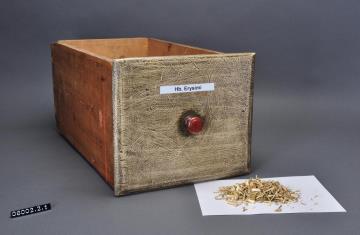 Schublade aus Nadelholz mit rotem Knauf und gezinkten Verbindungen (Schwalbenschwanzverbindung). Boden angeleimt und mit Holznägeln gesichert. Leicht wurmstichig. Vorderfront grau-braun angemalen. Mit selbstklebendem, laminiertem, weißem Kunststoff-Schriftband beschriftet. Enhält geschnittene Eschenblätter.