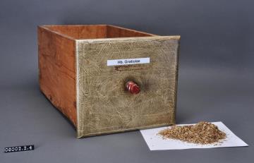 Schublade aus Nadelholz mit rotem Knauf und gezinkten Verbindungen (Schwalbenschwanzverbindung). Boden angeleimt und mit Holznägeln gesichert. Leicht wurmstichig. Vorderfront grau-braun angemalen. Mit selbstklebendem, laminiertem, weißem Kunststoff-Schriftband beschriftet. Enhält geschnittenes Gottesgnadenkraut.