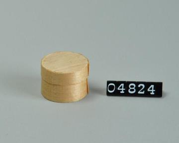 Hellbraune, zylinderförmige Holzdose (Holzbüchse) mit abgesetztem Standfuß bestehend aus Halbrundstab, Kehlung und geradem Abschluss. Flacher Stülpdeckel mit gerundetem Deckelrand und darüber zwei Kehlungen. Schwarz signiert. Innenseite Deckel mit Preisangaben: 1 Stück 6 Heller, dann acht Heller, später 20 Centesimi. Enthielt gewöhnliche Rauchkerzen.