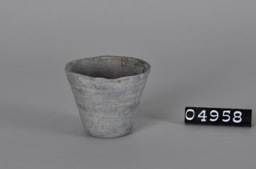 Kegelstumpfförmiger Körper aus Blei mit offener Grundfläche, d.h. sich nach oben öffnend. Unregelmäßiger Rand der Grundfläche. Deutliche Gebrauchsspuren.