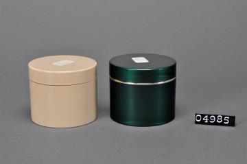 Zwei doppelwandige Mustersalbendosen, eine grün mit Goldrand und eine elfenbeinfarbig. Aufgeschraubter Deckel, elfenbeinfarbige mit Dichteinlage, grüne ohne. Boden mit Standring. Hergestellt von der Firma MAV aus Bologna.
