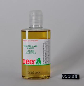 Im Grundriss ovale, transparente Kunsstoffflasche. Schraubverschluss aus satiniertem Kunststoff mit kleiner Öffnung und aufklappbarer Schutzkappe mit innenseitiger Prägung (VETROCUP). Boden leicht eingewölbt mit Prägung des Tidymen, Recyclingsymbol für Pet und Hersteller. Hergestellt von der Firma Vetrocap. Enthält Kräuterhaarwasser.