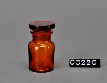 Im Grundriss quadratische Weithalslasche mit verstärkter Mundung und abgeflachten Kanten. Eingeprägtem Firmenzeichen in ovaler Kartusche: S.A.Farmaceutici Italia Montecatini Milano und Äskulapstab mit zwei Nattern. Braunes Glas.