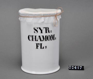 Zylinderförmiger Porzellantiegel mit Stülpdeckelrand, wenig ausladendem, schmalem, gerundetem Rand und Fuß. Stülpdeckelrand des Gefäßes ist abgebrochen, Stülpdeckel fehlt!. Mit Papiertektur und Bindfaden verschlossen.. Standboden nach innen eingezogen. Eingebrannte schwarze Signatur. Enthielt Kamillenblütensirup.