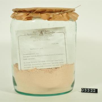 Zylinderförmiger Steinzeugtiegel mit Stülpdeckelrand, wenig ausladendem, schmalem Fuß. Flacher Stülpdeckel mit gerader Wand und zartem Rand. Standboden nach innen etwas eingezogen. Bodenfläche exzentrisch (Schnecke). Mit Signierapparat bedrucktes Papierschild, achteckig, mit rotem Rand und schwarzer Schrift auf ehemals weißem Grund. Enthielt eine Salbenmischung mit Bärenfett.
