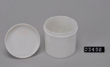 Weiße, runde Salbendose aus Kunststoff mit eng geriffeltem, leicht nach oben gewölbtem Deckel. Bajonettverschluss. Boden glatt mit Standring. Bodenprägung: GR. 100 und Firmenlogo.