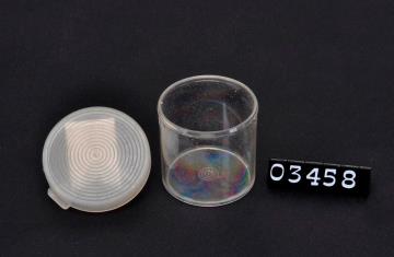 Zwei runde, transparente Salbendosen aus Plexiglas verschiedener Größe. Schnappdeckel aus weichem Kunststoff mit geprägten runden Kreisen. Glatter Boden mit Standring.