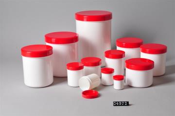 Weiße Salbendose mit rotem Schraubverschluss aus Polypropylen (PP) mit Standring und Bodenprägung: Inhaltsangabe in ml und g sowie Receyclingsymbol für PP.