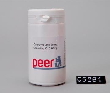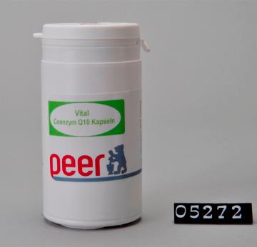Runde Dose aus weißem Kunststoff mit Sicherheits-Drehverschluss für Kapseln. Seitliche Naht. Boden mit geteiltem Standring. Deckel bedruckt mit Logo der Peer Apotheke, Brixen. Boden geprägt mit Volumenangabe EP 100 und Recycling-Code für PD-HE. Enthält 60 Kapseln Coenzym Q 10 60mg. Zur Verwendung laut ärztlicher Verordnung.