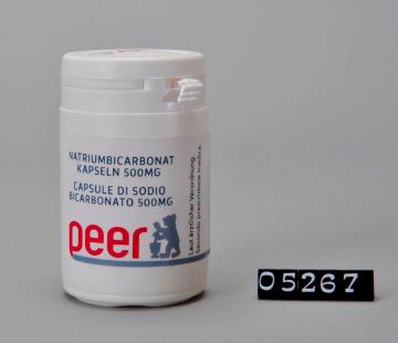 Runde Dose aus weißem Kunststoff mit Sicherheits-Drehverschluss für Kapseln. Seitliche Naht. Boden mit geteiltem Standring. Deckel bedruckt mit Logo der Peer Apotheke, Brixen. Boden geprägt mit Volumenangabe EP 75 und Recycling-Code für PD-HE. Enthält 50 Kapseln Natriumbicarbonat 500mg. Zur Verwendung laut ärztlicher Verordnung.