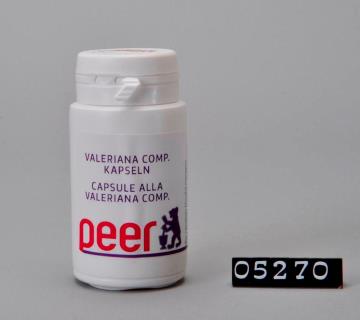Runde Dose aus weißem Kunststoff mit Sicherheits-Drehverschluss für Kapseln. Seitliche Naht. Boden mit geteiltem Standring. Deckel bedruckt mit Logo der Peer Apotheke, Brixen. Boden geprägt mit Volumenangabe 50 und Recycling-Code für PD-HE. Enthält 30 bzw. 10 Kapseln Baldriankapseln gemischt mit Hopfen- und Passifloraexreakt. Zur Verwendung bei nervöser Unruhe und bei Einschlafstörungen.