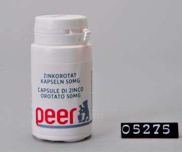 Runde Dose aus weißem Kunststoff mit Sicherheits-Drehverschluss für Kapseln. Seitliche Naht. Boden mit geteiltem Standring. Deckel bedruckt mit Logo der Peer Apotheke, Brixen. Boden geprägt mit Volumenangabe 50 und Recycling-Code für PD-HE. Enthält 30 Kapseln Zinkorotat. Zur Verwendung laut ärztlicher Verordnung.