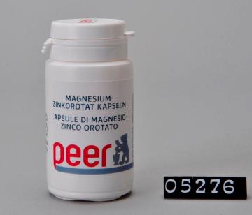 Runde Dose aus weißem Kunststoff mit Sicherheits-Drehverschluss für Kapseln. Seitliche Naht. Boden mit geteiltem Standring. Deckel bedruckt mit Logo der Peer Apotheke, Brixen. Boden geprägt mit Volumenangabe 50 und Recycling-Code für PD-HE. Enthält 30 Kapseln Magnesiumorotat mit Zinkorotat. Zur Verwendung laut ärztlicher Verordnung.