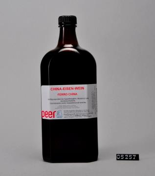 Brauner, achteckiger Flaschenkörper mit flacher Schulter und Seitennaht. Langer Mündungshals mit Schraubgewinde. Schwarzer Drehverschluss mit Dichtung aus PE-LD (LDPE). Bodenrand geriffelt, Boden mit Prägung des Volumens: 500. Enthält Chinaeisenwein, hilft Appetitlosigkeit, Antriebsschwäche und Blutarmut.