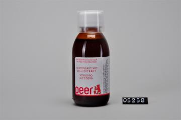 Brauner, zylindrischer Flaschenkörper mit abfallender Schulter und Seitennaht. Mündung verstärkt und Schraubgewinde. Schwarzer Sicherheitsdrehverschluss mit Dichtung aus PE-LD (LDPE). Mit aufgestecktem Dosierbecher. Seitliche Prägung des Volumens: 250. Bodenrand geriffelt. Enthält Kinderbalsam, hilft bei Blähungen und Verdauungsbeschwerden bei Kindern und Erwachsenen.