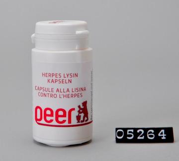 Runde Dose aus weißem Kunststoff mit Sicherheits-Drehverschluss für Kapseln. Seitliche Naht. Boden mit geteiltem Standring. Deckel bedruckt mit Logo der Peer Apotheke, Brixen. Boden geprägt mit Volumenangabe 50 und Recycling-Code für PD-HE. Enthält 30 Kapseln zur Verwendung bei Lysinnmangel ubnd immer wieder auftretenden Herpesinfektionen.