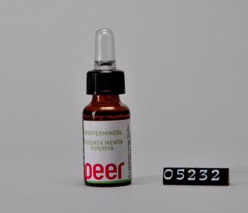 Brauner, runder zylindrischer Flaschenkörper mit abfallender Schulter und Seitennaht. Mündungsrand verstärkt, mit Schraubgewinde. Schwarzer Drehverschluss aus Polypropylen (PP) mit Tropfenzähler aus farlosem Glas und Kunsstoffkappe aus Polyvinylchlorid (PVC). Bodenrand geriffelt. Bodenprägung 10, und 4. Enthält Pfefferminzöl.