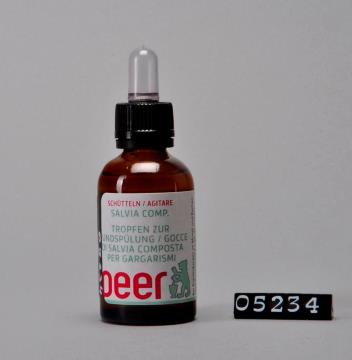 Brauner, runder zylindrischer Flaschenkörper mit abfallender Schulter und Seitennaht. Mündungsrand verstärkt, mit Schraubgewinde. Schwarzer Sicherheits-Drehverschluss aus Polypropylen (PP) mit Tropfenzähler aus farlosem Glas und Kunsstoffkappe aus Polyvinylchlorid (PVC). Bodenrand geriffelt. Bodenprägung: 30 und 13. Enthält zusammengesetzte Salbeitropfen zur Mündspülung.