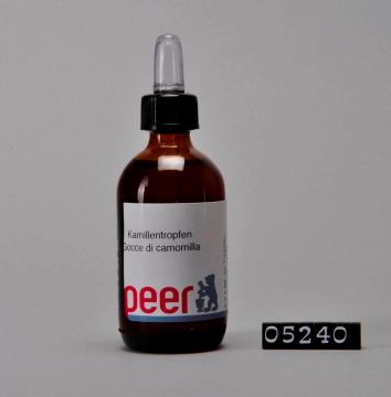 Brauner, runder zylindrischer Flaschenkörper mit abfallender Schulter und Seitennaht. Mündungsrand verstärkt, mit Schraubgewinde. Schwarzer Drehverschluss aus Polypropylen (PP) mit Tropfenzähler aus farlosem Glas und Kunsstoffkappe aus Polyvinylchlorid (PVC). Bodenrand geriffelt. Seitliche Prägung: 50, 20 und Punkte. Enthält Kamillentinktur.