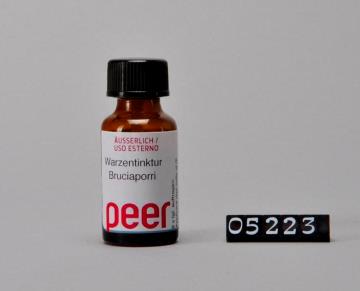 Brauner, zylindrischer Flaschenkörper, verstärkter Mündungsrand mit Schraubgewinde. Schwarzer Kunststoffverschluss mit Spatel aus Poliethylen. Bodenrand geriffelt. Mit Prägung der Volumenangabe 10ml. Weißes, bedrucktes Etikett der Peer Apotheke mit Inhaltsangabe, Chargennummer Barcode und Preis. Enthält Warzentinktur.