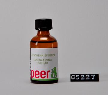 Brauner, zylindrischer Flaschenkörper mit abfallender Schulter der Firma DROP s.r.l.. Mündungsrand verstärkt mit Schraubgewinde und Tropfeinsatz aus Polyethylen. Schwarzer Drehverschluss aus Polypropylen. Bodenrand geriffelt, Flaschenkörper mit Seitennaht. Boden mit geprägter Volumenangabe. Farbig bedrucktes, selbstklebendes Etikett mit Produktnamen, Logo der Peer-Apotheke, Zusammensetzung, Chargennummer, Barcode und Preis. Enthält Latschenkiefernöl.