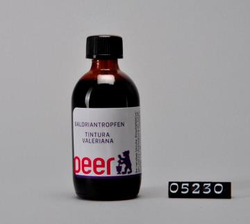 Brauner, zylindrischer Flaschenkörper mit abfallender Schulter der Firma DROP s.r.l.. Mündungsrand verstärkt mit Schraubgewinde und Tropfeinsatz aus Polyethylen. Schwarzer Drehverschluss aus Polypropylen. Bodenrand geriffelt, Flaschenkörper mit Seitennaht. Boden mit Volumenangabe mittels Prägung: 50 und F 73. Farbig bedrucktes, selbstklebendes Etikett mit Produktnamen, Logo der Peer-Apotheke, Zusammensetzung, Chargennummer, Barcode und Preis. Enthält Baldriantropfen.
