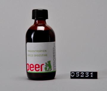 Brauner, zylindrischer Flaschenkörper mit abfallender Schulter der Firma DROP s.r.l.. Mündungsrand verstärkt mit Schraubgewinde und Tropfeinsatz aus Polyethylen. Schwarzer Drehverschluss aus Polypropylen. Bodenrand geriffelt, Flaschenkörper mit Seitennaht. Boden mit Volumenangabe mittels Prägung: 50 und F 91. Farbig bedrucktes, selbstklebendes Etikett mit Produktnamen, Logo der Peer-Apotheke, Zusammensetzung, Chargennummer, Barcode und Preis. Enthält Magentropfen.