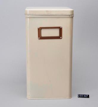 Im Grundriss quadratische Dose aus Weißblech mit Scharnierdeckel und angenietetem Schilderrahmen (68x35mm). Boden gefalzt und mit Standring. Außen elfenbeinfarbig einbrennlackiert.