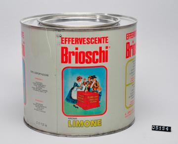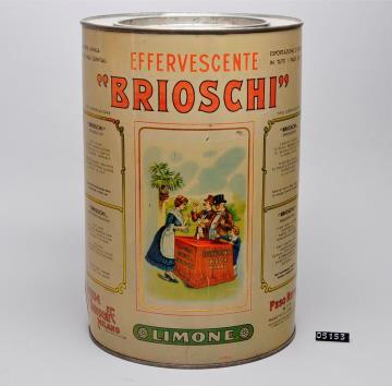 Runde Dose aus Weißblech mit Patentdeckel für Effervescente Brioschi in Granulatform. Boden und Oberseite gefalzt und angesetzt. Längsseitig einmal gefalzt. Boden mit Standring. Patentdeckel aus einem Stück gestanzt, mit umgebogenem Rand. Direkt aufgedruckte bunte Produkt- und Firmenbezeichnung: Bild einer Frau in blauem Kleid und weißer Schürze die, über einem roten Tisch gebeugt, aus einer Dose zwei Herren und einem Kind mit Trinkgläsern Effervescente Brioschi reicht. Schrift einfach eingerahmt links und rechts vom Bild in vier Sprachen: "Rinfescante dissetante di rapida solubilità di pronta effervescenza di ottimo gusto; Conservare ben chiuso in luogo fresco e asciutto".