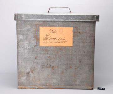 Rechteckige Dose aus Blech, innen verzinnt, mit Stülpdeckel für Melissenblätter. Bodenplatte aufgebogen, mit Seitenwand verlötet. Diagonale Seitenkanten ebenfalls umgebogen und verlötet. Mündung um runden Eisenstift gewickelt. Deckelzarge gefalzt. Deckel unverzinnt mit aufgenieteter Handhabe.Schild mit Folia Melissae = electa, erhalten am 20.II.34 von der Firma Fritz Pezold.