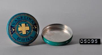 Dreifarbig bedruckte, runde Dose aus Weißblech für Vaseline. Nach oben gewölbter Stülpdeckel . Unterseite mit Standring. Grundfarbe außen blau-grün. Deckel dekorativ bedruckt. Innen beiges Kreuz mit in den Ecken jeweils einer Aeskulapnatter, von einem Zierkreis umrahmt. Schrift in dunkelblau, umrahmt von einem rundem Zierrand. Die Vaseline, wurde warm eingegossen. 50 Schachteln vom Bestand in braunem Packpapier, zugebunden mit dünner Schnur, original verpackt.