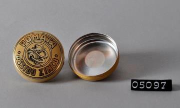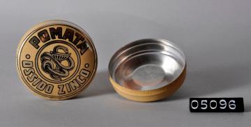 Zweifarbig bedruckte, runde Dose aus Weißblech für Zink-Salbe. Nach oben gewölbter und bedruckter Stülpdeckel . Unterseite mit breitem Standring und eingewölbtem Boden. Grundfarbe außen braun-beige. Salbenname und Aeskulapschlange mit Kelch; golden mit schwarzem Schatten aufgedruckt. Salbe, meist auf Vaselinbasis, wurde warm eingegossen.