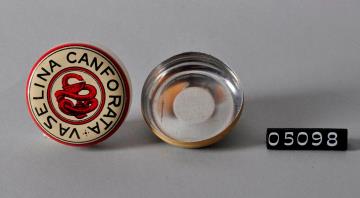 Dreifarbig bedruckte, runde Dose aus Weißblech für Kampfer-Salbe. Nach oben gewölbter und bedruckter Stülpdeckel . Unterseite mit breitem Standring. Grundfarbe außen beige. Salbenname schwarz und Aeskulapschlange mit Kelch und rundem Rahmen rot aufgedruckt. Salbe, meist auf Vaselinbasis, wurde warm eingegossen.