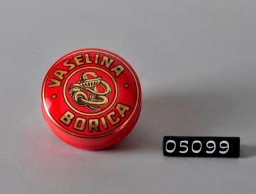 Dreifarbig bedruckte, runde Dose aus Weißblech für Borsalbe. Nach oben gewölbter und bedruckter Stülpdeckel . Unterseite mit breitem Standring. Grundfarbe außen rot. Salbenname, Aeskulapschlange mit Kelch in rundem Rahmen golden aufgedruckt. Salbe, meist auf Vaselinbasis, wurde warm eingegossen.