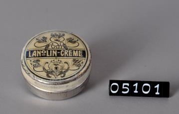 Zweifarbig bedruckte, runde Dose aus Weißblech für Lanolincreme. Dekorativ bedruckter Stülpdeckel. Boden mit Standring. Deckel außen goldgelbe Grundfarbe, mittig schwarzes Band, darauf Inhaltsangabe in Negativschrift. Ober- und unterhalb dieses Bandes floreale Elemente. Obere Hälfte erinnernd an Hundszahnlilie. Unterteil der Dose unbedruckt. Alles umrahmt von schwarzem Doppelrand.