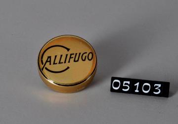 Zweifarbig bedruckte, runde Dose aus Weißblech für Hühneraugensalbe. Boden mit Standring. Ober- und Unterteil der Dose mit goldener Grundfarbe. Salbenname schwarz auf der Oberseite des Deckels mittig aufgedruckt.