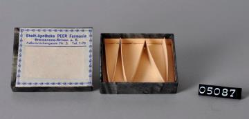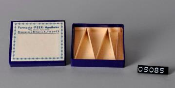 Rechteckige Kästchen aus Karton mit Stülpdeckel zur Verpackung und Abgabe von sechs Zäpfchen. Beiger Karton mit schwarz marmoriertem Papier überzogen. Auf dem Deckel weiße Etikette mit blauem Dekorahmen und Firmeneindruck. Innen leporelloartiger Einsatz um die getrennte Lagerung der sechs Zäpfchen zu garantieren.