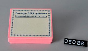 Mehrfarbig bedruckte, gefalzte und gelötete, in der Grundflache fast quadratische, dekorative Blechschachtel mit Scharnierdeckel. Innen graues Blech, unlackiert. Am Deckelfalz Reste der Sicherheitsbanderole. Diente zur Aufbewahrung von 50 Briefchen des Abführmittels Magnesia S. Pellegrino. Zweite Schachtel mit Stülpdeckel, für 125 Briefchen.